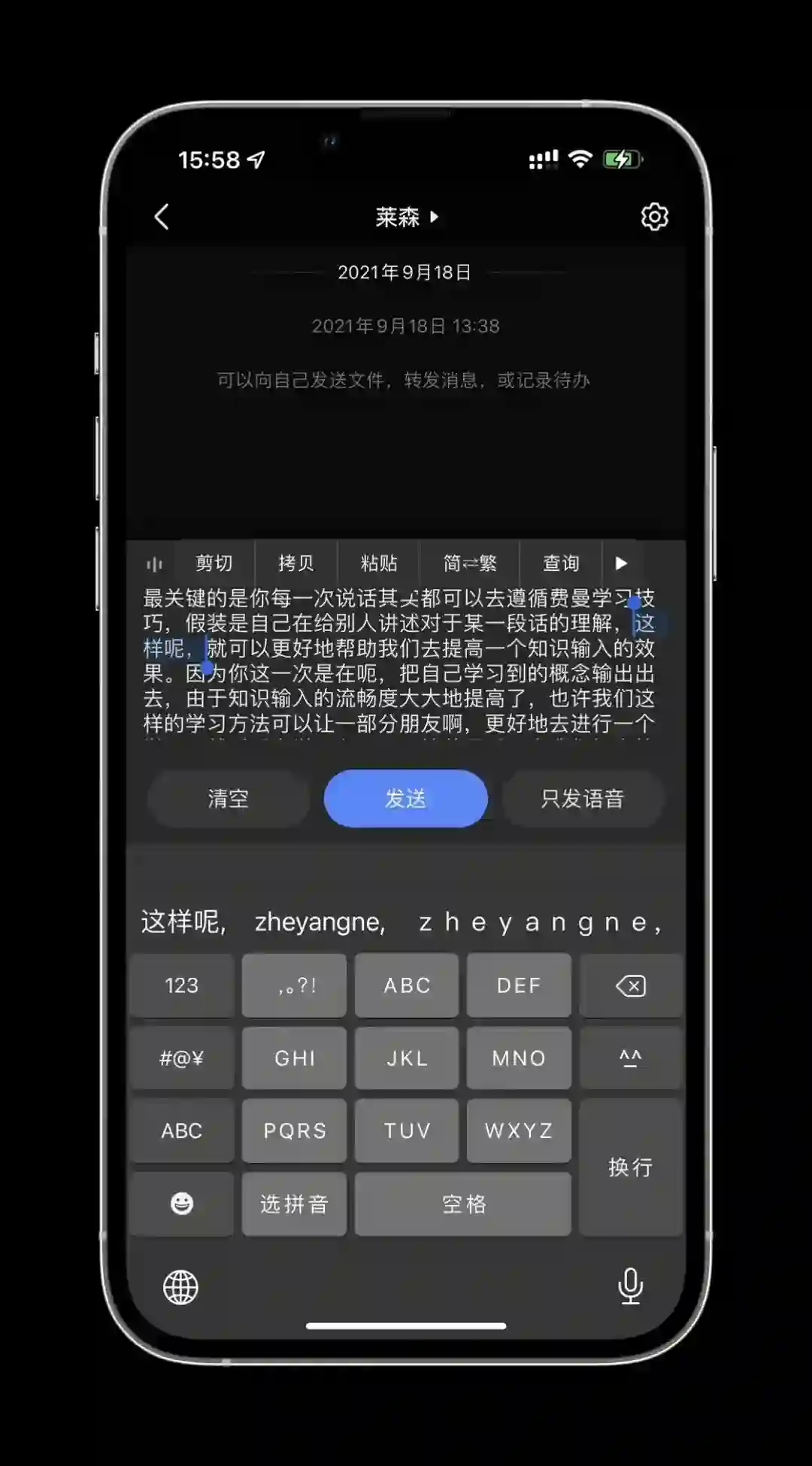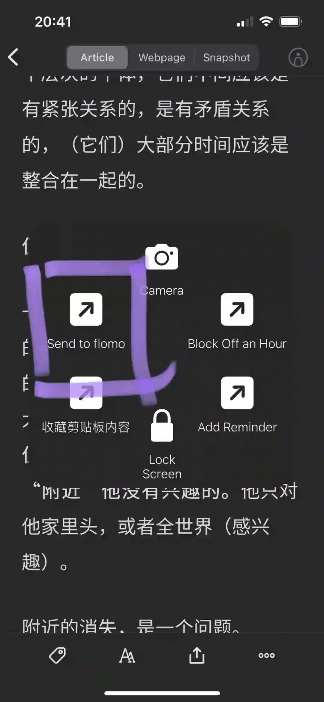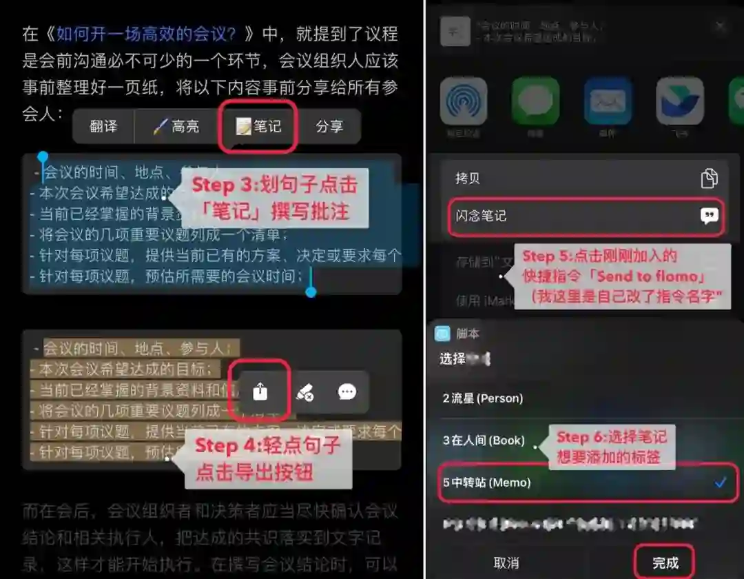 最关键的是,你每一次说话其实都可以去遵循「费曼学习技巧」。假装在给别人讲述自己对于某一段话的理解,这样可以更好地提高知识输入的效果。由于知识输入的流畅感大大提高,也许它可以让你更加热爱「用自己的话解释新知」。接着复制文字,用 AssistiveTouch 打开「Send to Flomo」快捷指令,粘贴并选择标签对知识进行串联和管理,方便你事后进行更好地回顾。