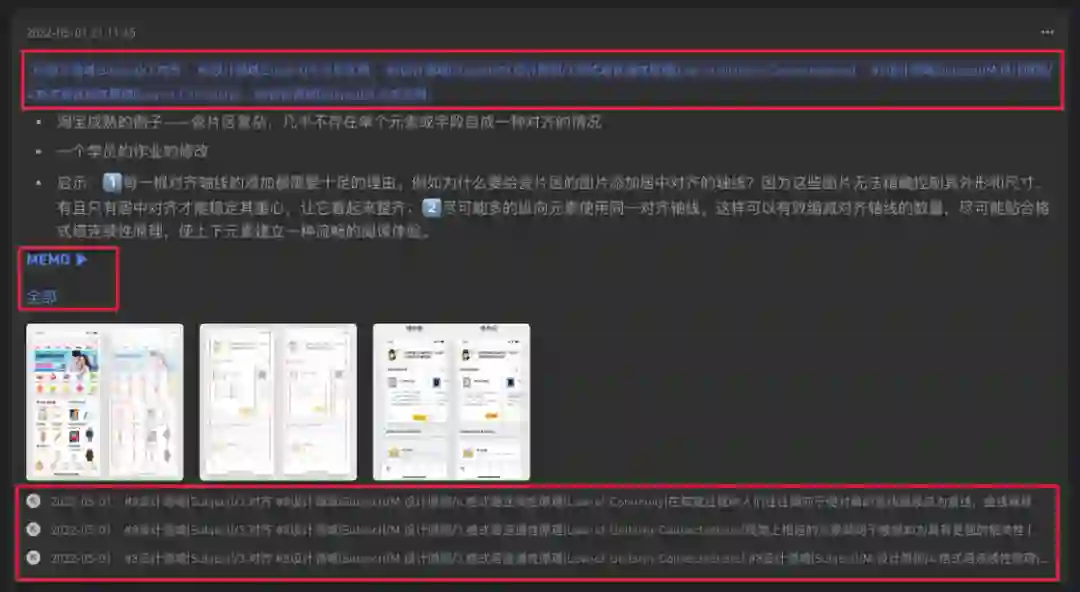 创造性的用法还有很多,不过不是我的主要用法,所以就不一一赘述了。千言万语一句话——「唯 Flomo 塑造了我输出记录的习惯」。也许产品不仅仅是产品本身,还包括一套构建于其之中的「体制」。这套「体制」即指「有明确目的」。当你拿起一把好的菜刀的时候,它强化你「做一顿好吃的晚餐」的意愿;当你佩戴好做工精良的手表,它强化你「要珍视时间和效率」的意愿。