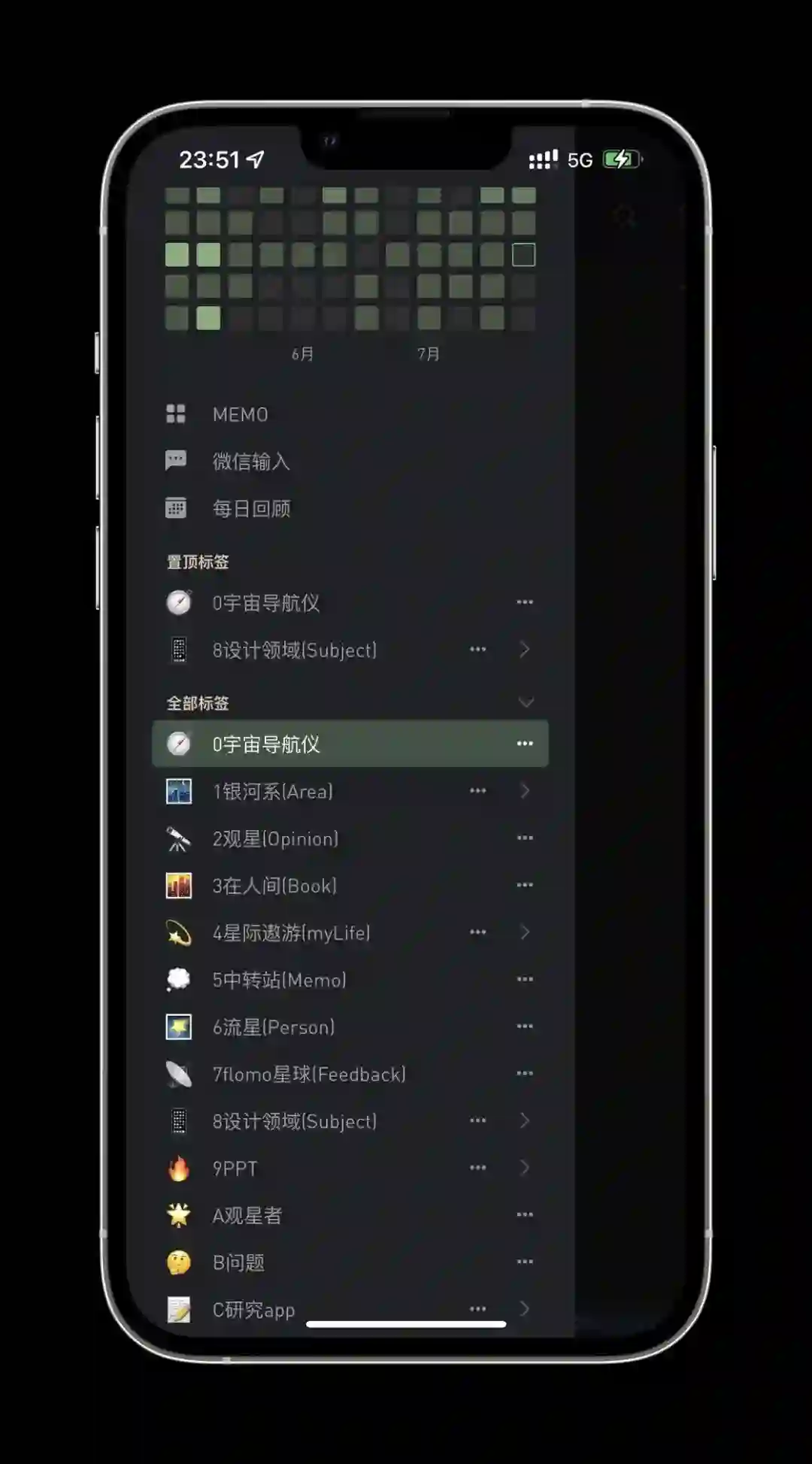我在 Flomo 101(即 Flomo 官方说明文档)里跟随创始人少楠的视角接触到了用标签管理知识卡片的方法。于是我很快又带着热情创建了一个特别的标签系统(如图)。在接下来的一个月,我常常在大学寝室和教室往返的路途以及洗澡之后记录灵感。