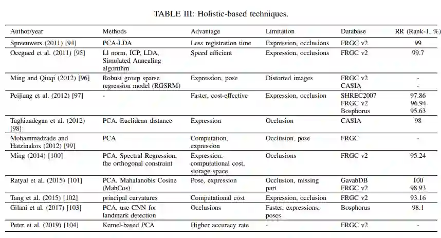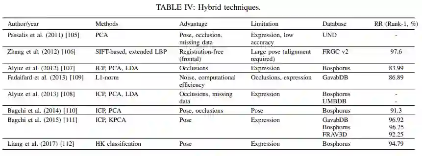 混合 3D 人脸识别方法结合了不同类型的方法(基于局部和基于整体),并将局部和全局特征应用于人脸匹配。通过结合不同的特征提取技术,它们可以处理更多的面部差异,例如表情、姿势和遮挡。最近的混合方法在下表 IV 中进行了比较。