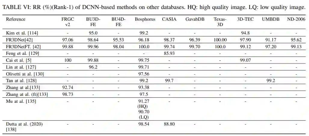 下表 V 列出了最近的基于 DCNN 的 3D 人脸识别技术。