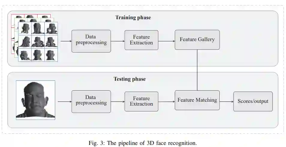 如下图 3 所示,传统 3D 人脸识别系统中有两个主要阶段:训练和测试。在训练阶段,需要 3D 人脸数据来生成特征库,面部特征通过数据预处理和特征提取模型获得,然后保存在特征库中;在测试阶段,获取一个探针作为目标人脸,并进行与训练阶段相同的数据预处理和特征提取过程。
