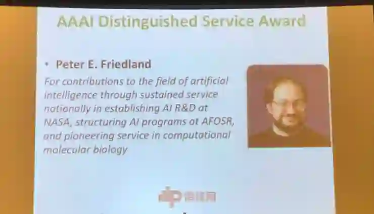 每年的杰出服务奖授予一位对 AI 社群作出突出贡献和服务的个人。今年,这一奖项颁给了 Peter Friedland,他曾在 NASA 建立 AI 研究部门、在美国空军科学研究局部署人工智能相关计划,以及在计算分子生物学取得了相关成就。