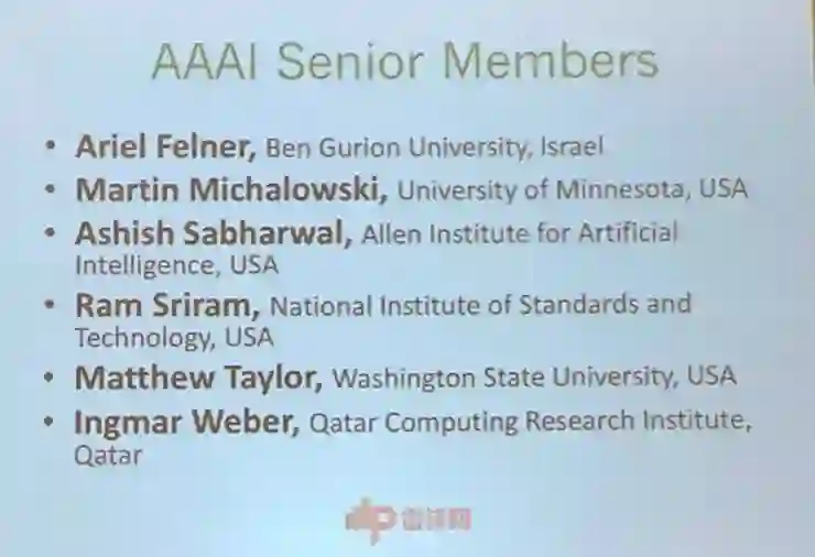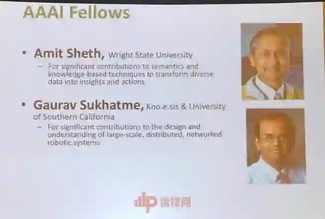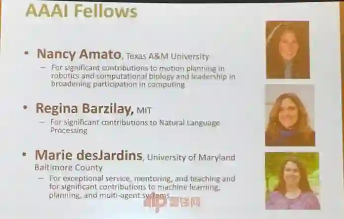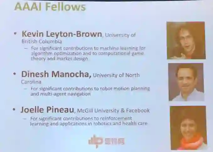 接下来是 AAAI Fellow 的公布仪式。今年的 AAAI 新当选 Fellow 全部被北美地区(美国、加拿大)的学者包揽,共 8 位,名单如下: