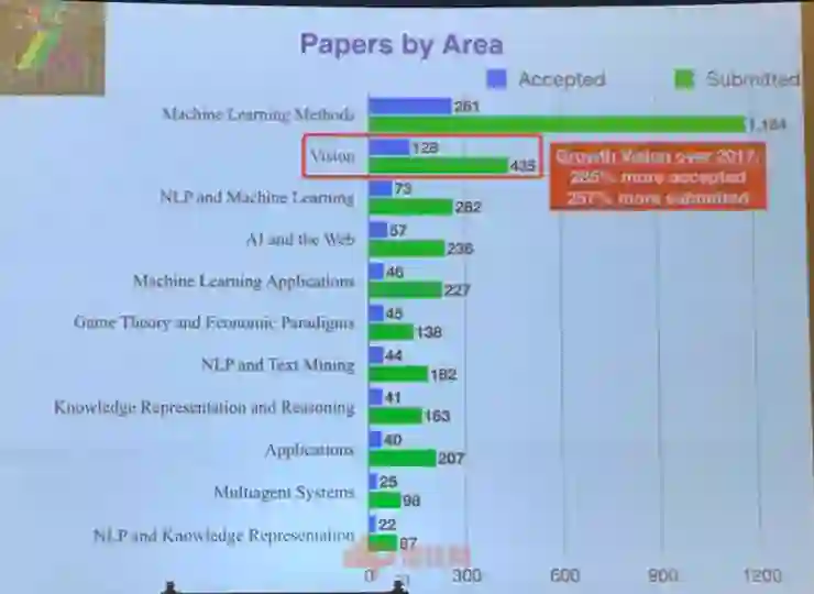 今年,机器学习方法占据投递论文数量和录用数量的宝座(投稿 1184 篇,收录 261 篇);而值得一提的是,AAAI 2018 在视觉领域(Vision)的投稿数和论文录用数实现了质的飞跃,以 257% 的投稿增长和 285% 的录用增长比重排在第二名。NLP 及机器学习、AI 和网络、机器学习应用等相关研究领域紧随其后。
