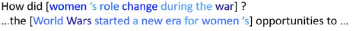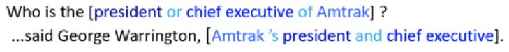 文句和答句同时包含了某个实体(president of chief executive of Amtrak 与 Amtrak’spresident and chief executive),但是它们的顺序有可能有一些颠倒,其中颠倒的本身会有一些词的变化,比如从 of 变成 ’s。