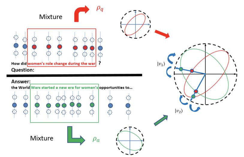 与 CNN 类似,本文用滑动窗口来对一些列 N-gram 来构建一个混合系统,这样混合系统的概率属性由一个密度矩阵来描述。本文模型将需要匹配的两个文本对象各自的 N-gram 同时向一个投影平面投影,投影的长度的平方对应混合系统投影到该投影平面的概率。