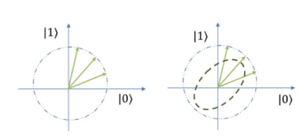 所以再推而广之,那么对所有的方向都可以去做投影,最后的结果就类似图中的虚线椭圆(虚线与实线向量相接的点描述投影的长度,它的数学描述来自后文提到的密度矩阵)。