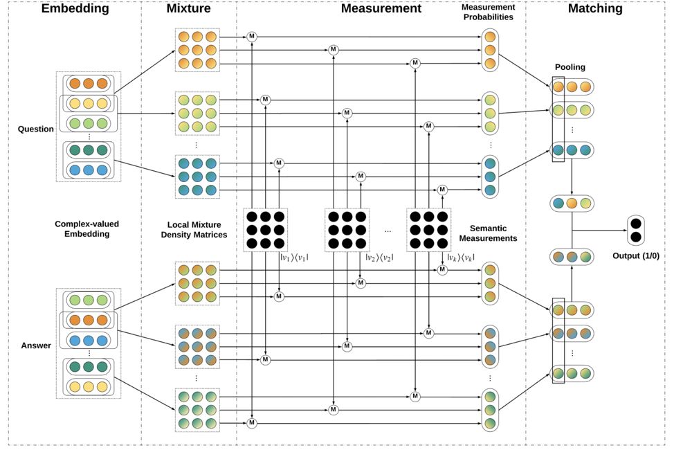 本文模型用滑动的窗口构建两个文本对象的 N-gram 的密度矩阵表示,然后采用一组测量投影操作,同时测量两个文本对象所有的 N-gram 窗口里的混合系统(由密度矩阵描述)。最后通过一组 max pooling 操作得到每个测量向量在所有 N-gram 最大的投影概率,最后通过向量的 cosine 距离得到匹配的分数。