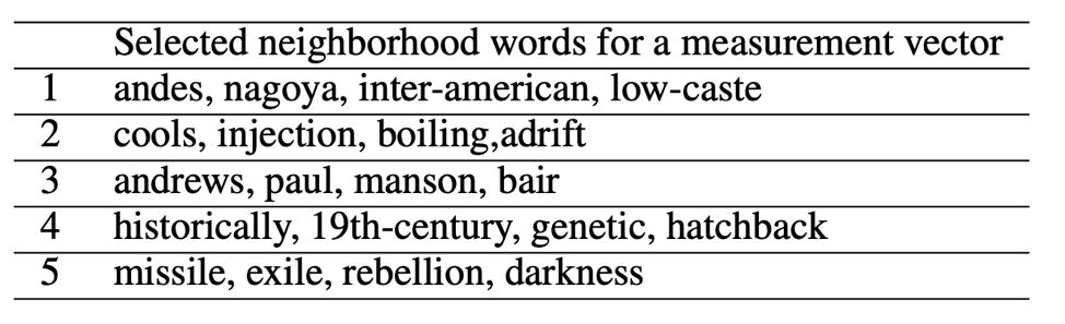 选取了其中五个投影向量,将其最近的五个词展示出来。由图中学到的测量向量的含义可以通过词语来描述。如下图: