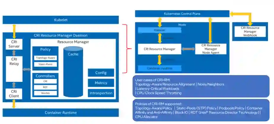 在 Kubernetes 发布初期,针对 CPU 和内存的管理与分配做的比较简单,随着新版本的发布,逐步有一些新的功能加进来(如 CPU Manager、Topology Manager 等),但 Kubernetes 缺省的 CPU Manager、Topology Manager 仍无法了解服务器级硬件的复杂内部架构和 CPU 本身的能力,这就可能会导致 CPU 的资源分配决策和计算性能无法达到最优。对于英特尔® 至强® 可扩展处理器来说,其架构复杂、功能强大,如果想要在上面部署 Kubernetes 集群来高效支撑云业务,就需要对其拓扑结构和 CPU 的强大功能暴露给 Kubernetes 集群,这时 CRI-RM 因此而生。