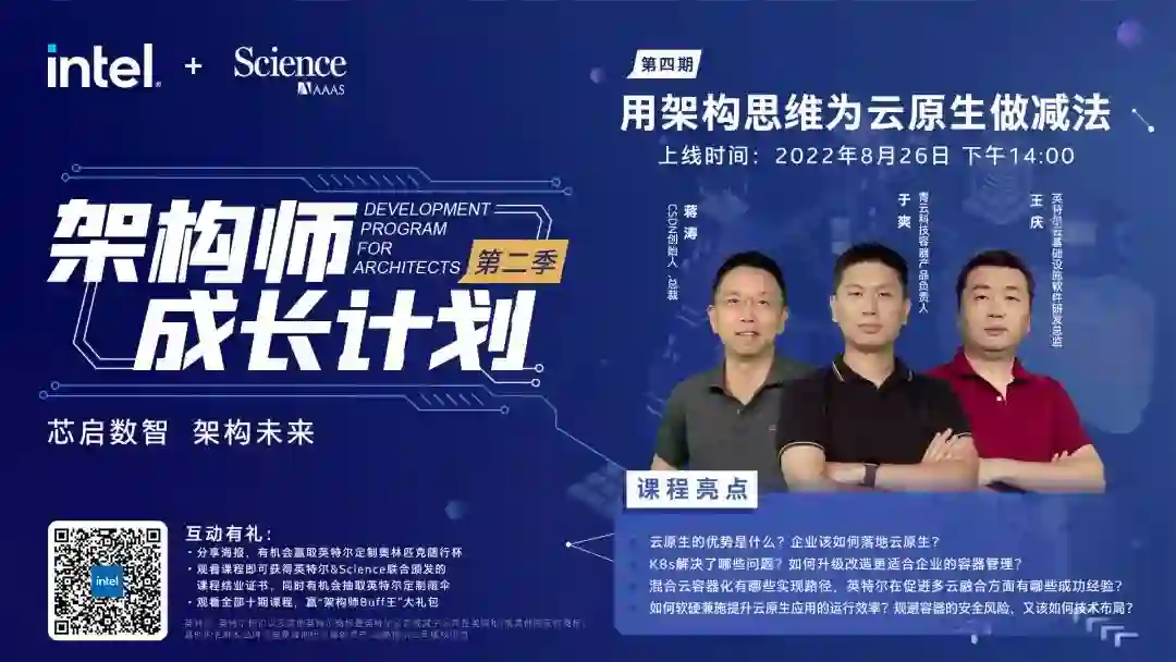 更多云原生技术干货,扫描下方海报二维码,观看英特尔联合国际学术期刊《科学》共同推出的“架构师成长计划”第四期《用架构思维为云原生做减法》精彩回放!