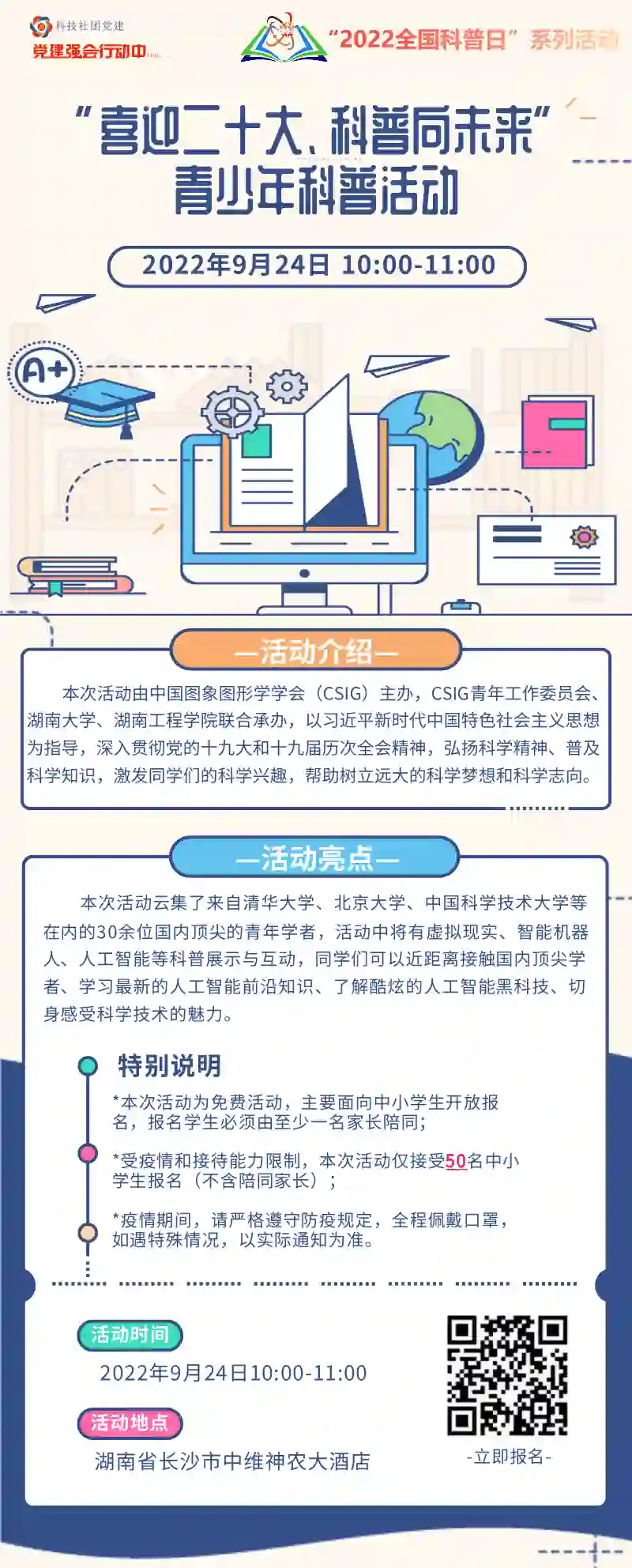 为切实发挥学会党组织的政治引领作用,提高公众科学素养,在2022年全国科普日即将到来之际,由中国图象图形学学会主办,学会青年工作委员会、湖南大学、湖南工程学院联合承办的“党建+科普”线下活动将在青年科学家会议期间(2022年9月24日上午10:00-11:00,长沙中维神农大酒店)举办。