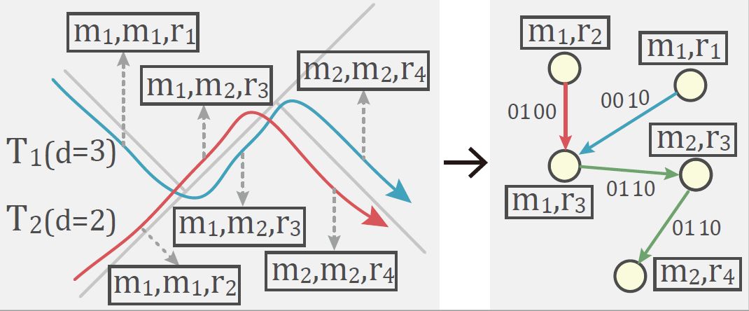 基于图结构的可达性索引建立过程。左图红、蓝两条轨迹的公共部分可以被压缩为右图图中绿色的边
