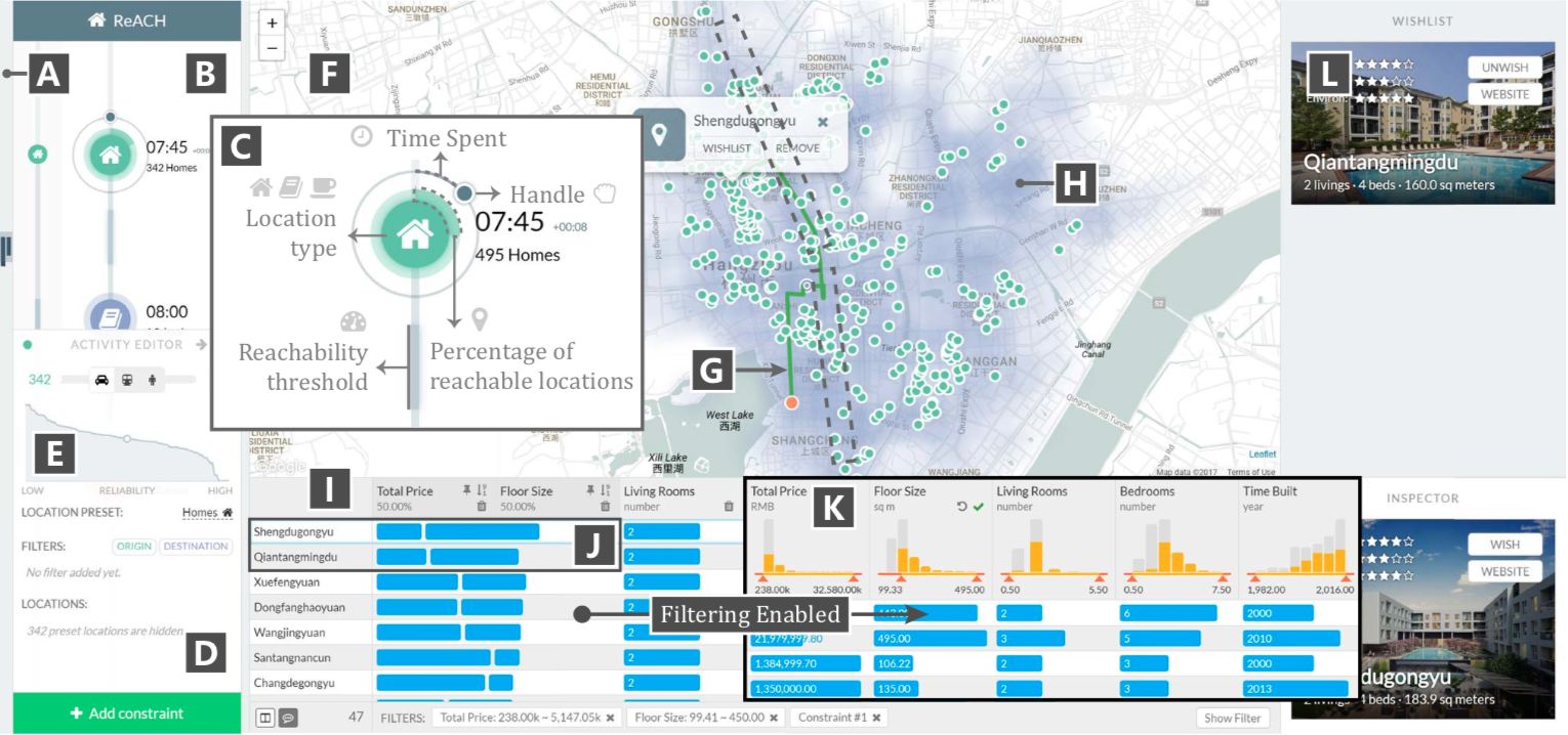 从第二类需求出发,研究团队开发了一套在线住房选址可视分析系统。将价格、面积、卧室数量等要包括在内的同时,重点考虑了在地理决策中占据重要地位的地标位置可达性(Reachability)。