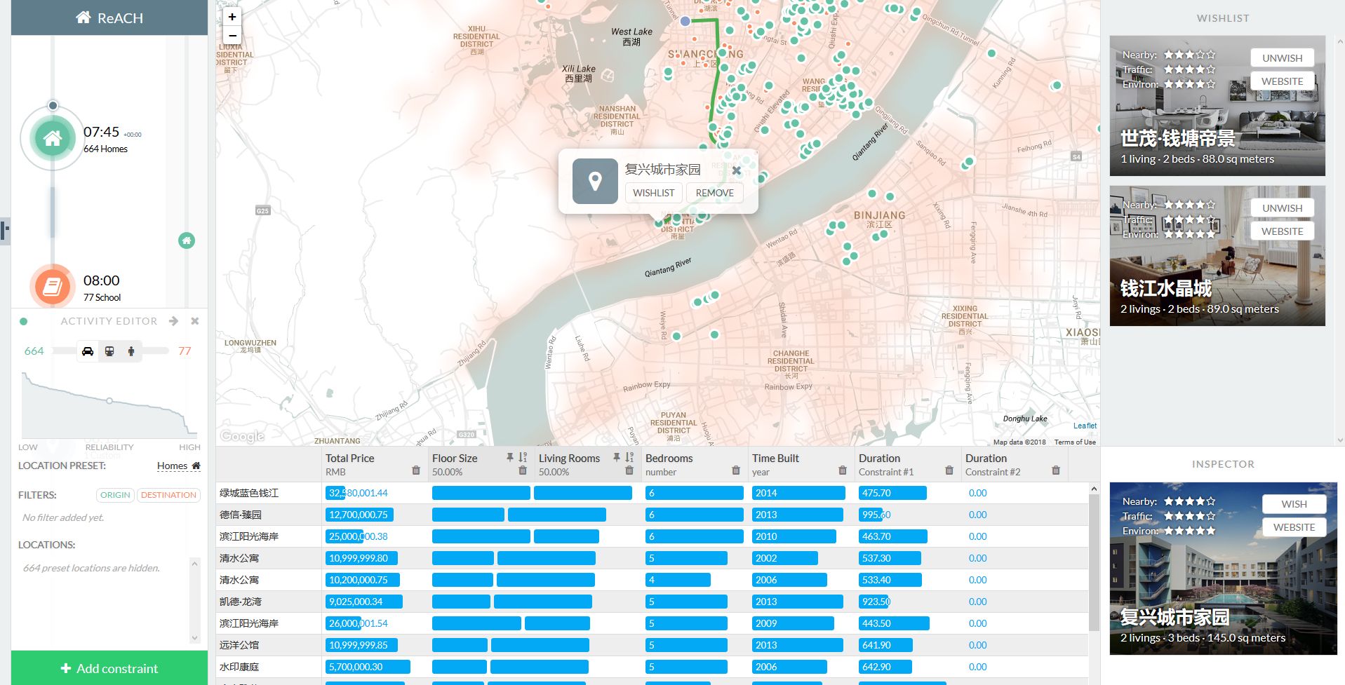基于系统推荐,用户还可自行筛选符合行程的地点,缩小位置集合。针对第一类需求,用户可就价格、面积、完成行程所需时间等属性的范围进行调整,并按照个人偏好进行组合排序,从而找到自己的最佳住宅。