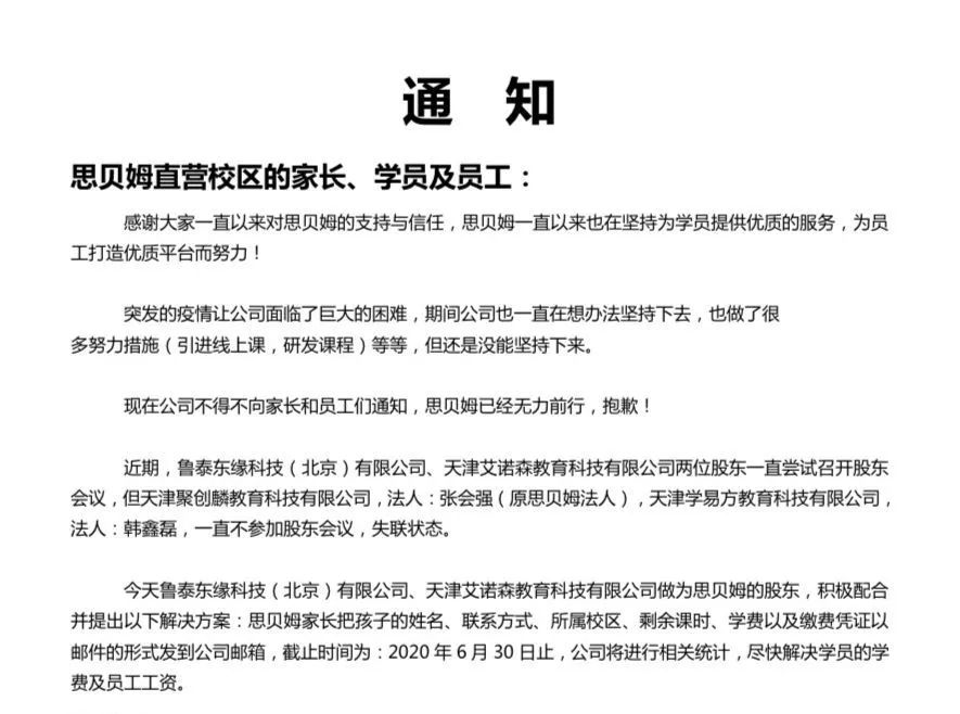 6月6日,思贝姆儿童成长中心发布公告称,由于受到疫情影响,以及公司内部存在相关股东失联的情况,思贝姆将关闭在北京的4家直营校区,分别为花乡奥莱校区、青塔校区、京荟校区和中关村校区。