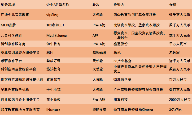 资本层面,本周获融资的教育企业不在少数。国内,职问宣布获得腾讯的战略融资,MCN品牌101名师工厂完成千万元Pre-A轮投资等;国外,印度教育科技企业iNurture获3亿卢比融资。