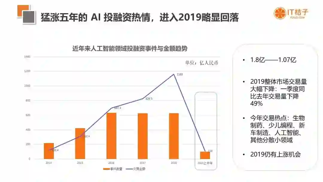 该数据目前仅统计到 4 月中旬,2019 年资本市场表达了对硬科技、企业服务的关注,人工智能投资仍有上涨空间。