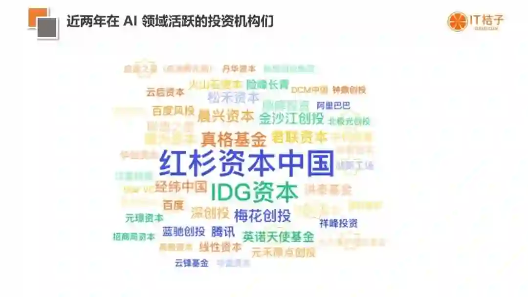 近两年在 AI 投资领域最活跃的投资方,从数量上看综合类的大型基金红杉中国、IDG 的覆盖量绝对是大头,尤其这两家 VC 在近两年开始进行投资阶段的扩张,向早期的布局也越来越多。其他大比例投资 AI 领域的机构还有启迪之星、北极光、创新工场、明势资本、百度资本、水木清华校友基金、英诺天使等。