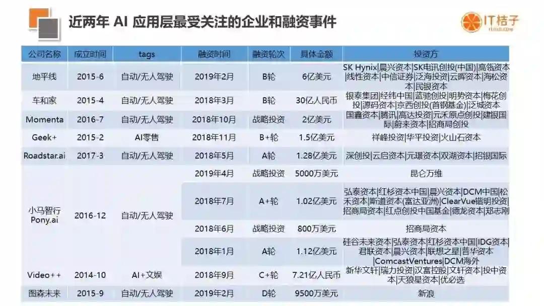 在 AI 应用层面的交易,首先从金额上看,由于无人驾驶处在「新能源造车+人工智能」这两个热门领域的交叉点,上榜企业多数为无人驾驶技术相关。
