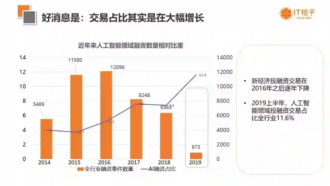 2019 上半年 AI 领域的交易量占全行业的比重达到 11.6%。