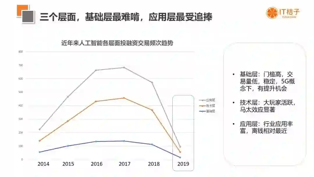 把人工智能的三个层面分别的投融资数据拆开看,会发现: