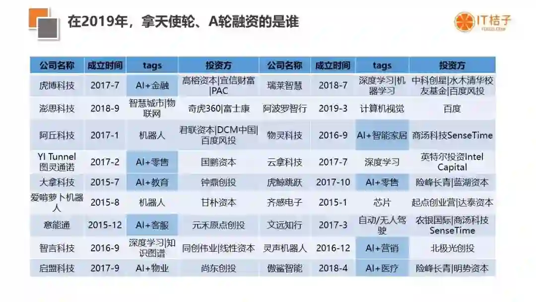马太效应如此残酷,初创企业的出路在哪里呢?观察 2019 年融资的天使轮、A 轮项目,大部分都在尝试「AI+应用场景」的探索,包括在零售、客服、金融、营销、教育、医疗等等领域。天使投资机构们也表现出了对 AI 初创企业的热情支持。