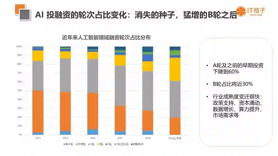 从人工智能行业近几年的轮次占比变化图可以看到,早期投资是越来越少,该领域到 2019 几乎没有种子投资这样的概念了,天使和 A 轮到占比下降到了 60% 以下,B 轮占比将近 30%。而这仅仅是五六年的时间发生的变化。