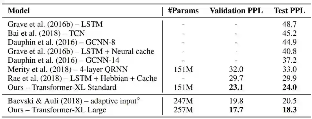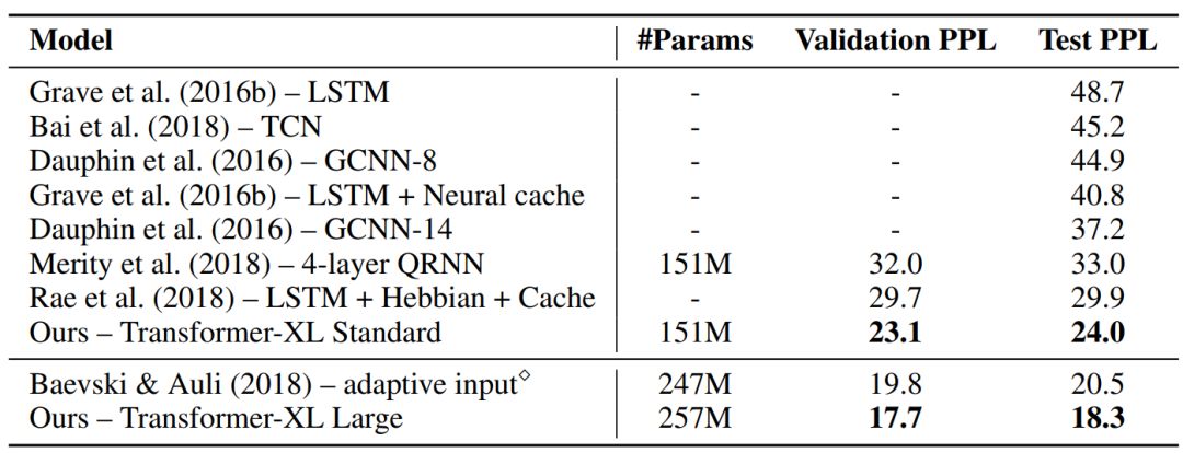 表 1:与在 WikiText-103 上得到的当前最佳结果进行对比。