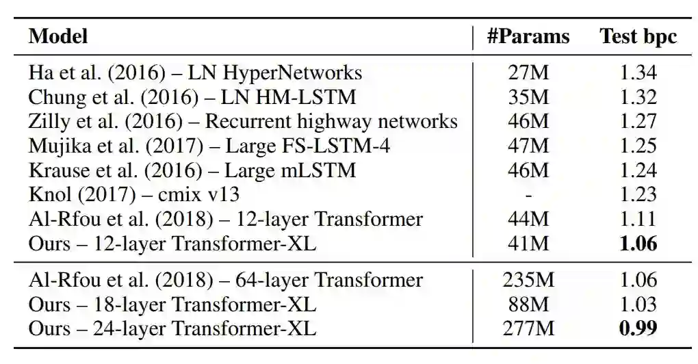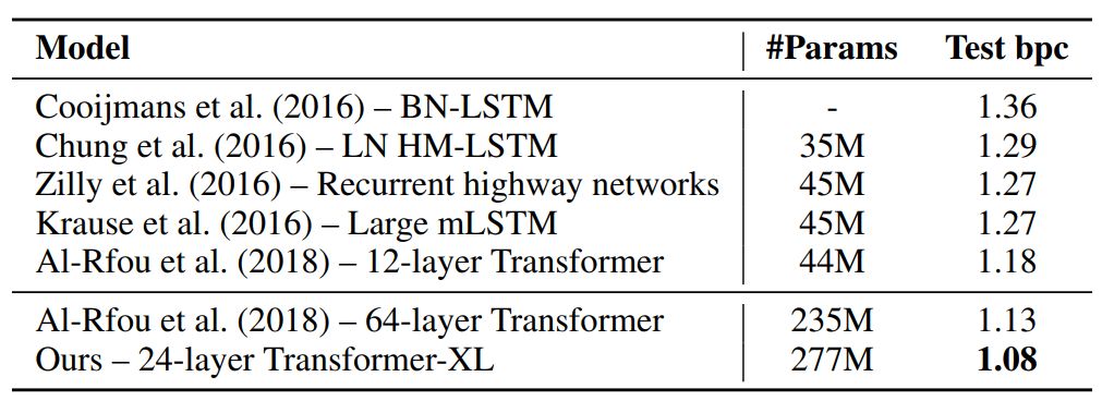 表 2:与在 enwiki8 上得到的当前最佳结果进行对比。
