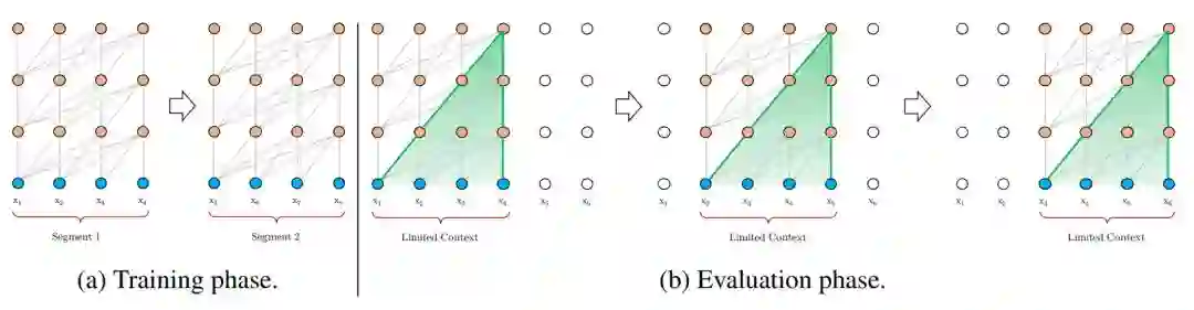 近期,Al-Rfou 等人(2018)设计了一组辅助损失来训练深度 Transformer 网络进行字符级语言建模,其结果远超 LSTM。虽然已经取得成功,但是 Al-Rfou 等人(2018)的 LM 是在长度固定的几百个字符片段上独立训练的,没有任何跨片段的信息流。由于上下文的长度是固定的,因此模型无法捕获任何超过预定义上下文长度的长期依赖性。此外,长度固定的片段都是在不考虑句子或其它语义边界的情况下通过选择连续的符号块来创建的。因此,模型缺乏必要的上下文信息来很好地预测前几个符号,这就导致模型的优化效率和性能低下。我们将这个问题称为上下文碎片化。