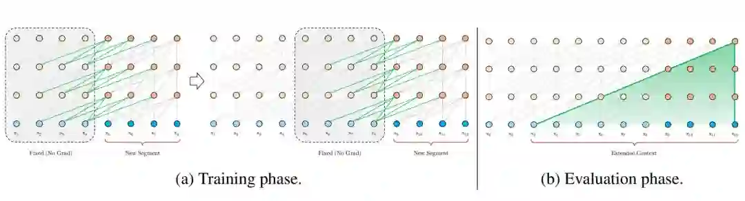 为了解决使用固定长度上下文的局限性,我们在 Transformer 架构中引入了循环机制。在训练过程中,为之前的片段计算的隐藏状态序列是固定的,将其缓存起来,并在模型处理后面的新片段时作为扩展上下文重复使用,如图 2a 所示。