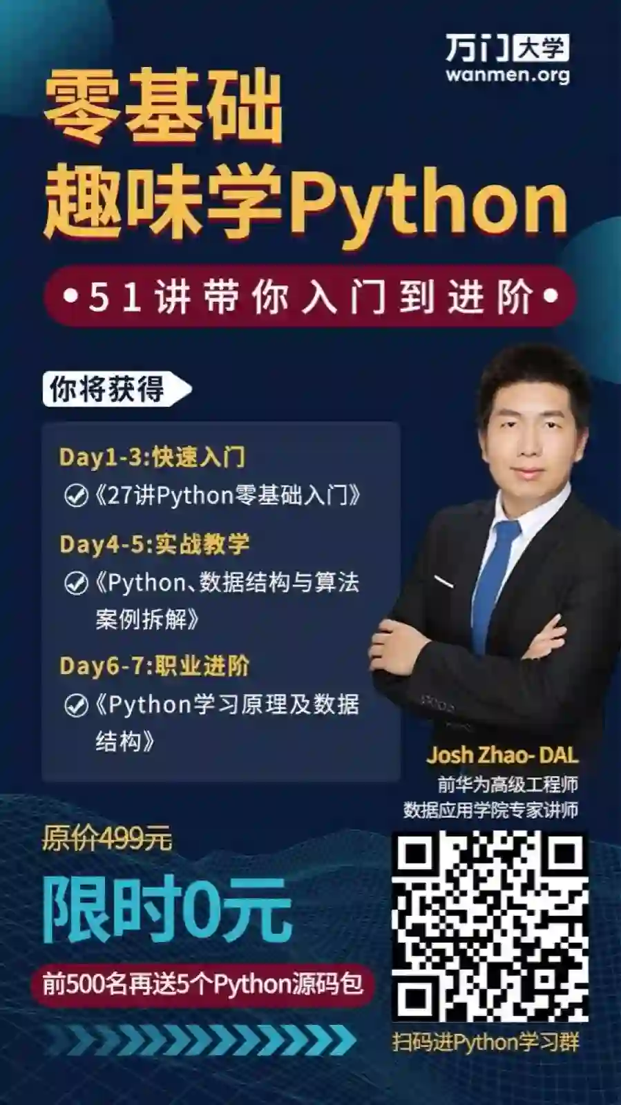 所以想给大家推荐一门免费python入门课,由数据应用学院(DAL)讲师团——Josh Zhao- DAL(前华为高级工程师,数据应用学院专家讲师,十年开发管理经验)为大家讲授。