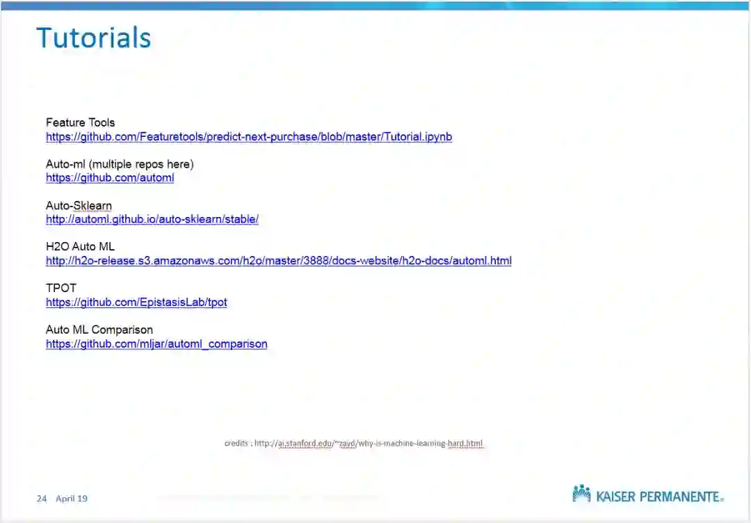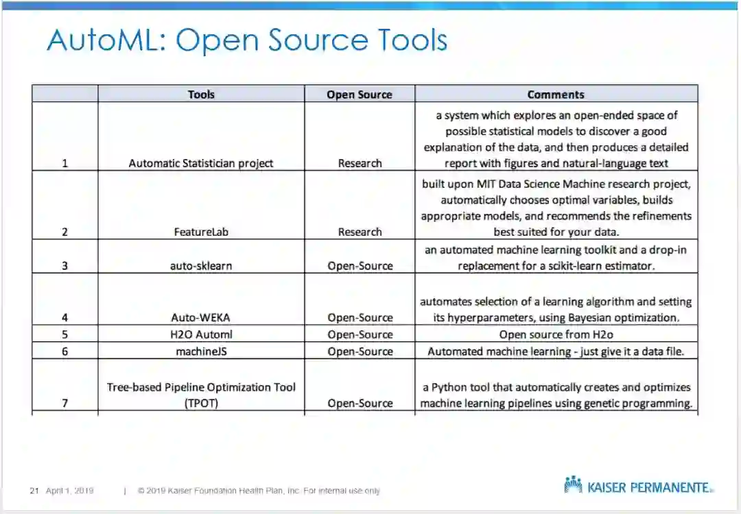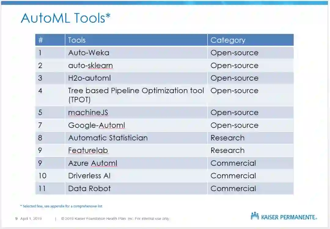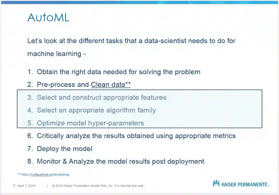 医疗保健行业需要精确和高度可解释的模型。根据医疗保健的应用领域(临床和操作),这些模型可以从预测到分割和聚类到分类和回归,包括自然语言处理(NLP)和图像处理等领域。然而,数据往往会受到信息缺失和值错误的困扰,因此数据准备和建立一个具有可解释性的模型都是一项耗费时间的任务。