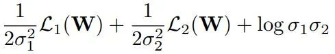 2. 对于比较复杂的多任务loss之间平衡,这里推荐一篇通过网络直接预测loss权重的方法[1]。以两个loss为例, 和 由网络输出,由于整体loss要求最小,所以前两项希望 越大越好,为防止退化,最后第三项则希望 越小越好。当两个loss中某个比较大时,其对应的 也会取较大值,使得整体loss最小化,也就自然处理量纲不一致或某个loss方差较大问题。