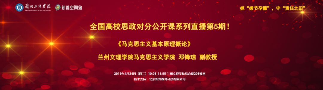 为深入贯彻落实重要讲话精神,抓住“拔节孕穗期” ,守好“思政责任田”,展示思政课堂教学创新,上海电机学院、中国石油大学(华东)、湖北汽车工业学院、兰州文理学院、天水师范学院等高校马克思主义学院联合“对分课堂”创始人、复旦大学社会发展与公共政策学院张学新教授,在全国范围首推基于对分课堂新型教学模式的真实课堂情境下的思政课系列直播活动,第5场直播(马克思主义基本原理概论)将于4月24日10:05兰州文理学院马克思主义学院启动!