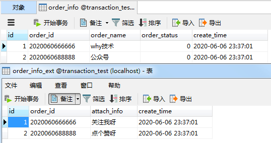 是怎么回事呢,为了模拟这个场景,我在本地创建了两张表,订单表(orderInfo)和订单扩展表(orderInfoExt),他们之间用订单号进行关联: