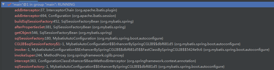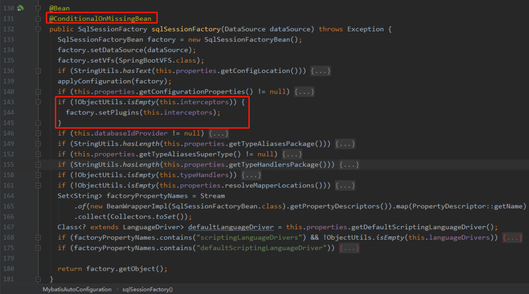 @ConditionalOnMissingBean ,看名字也知道了,当你的项目里面没有自定义的 SqlSessionFactory 的时候,才会由源码给你注入,这个时候才会正在的注册上插件: