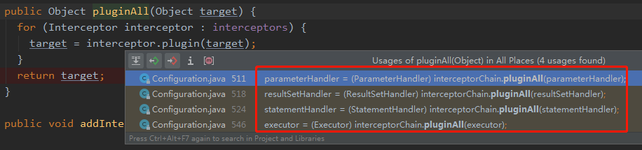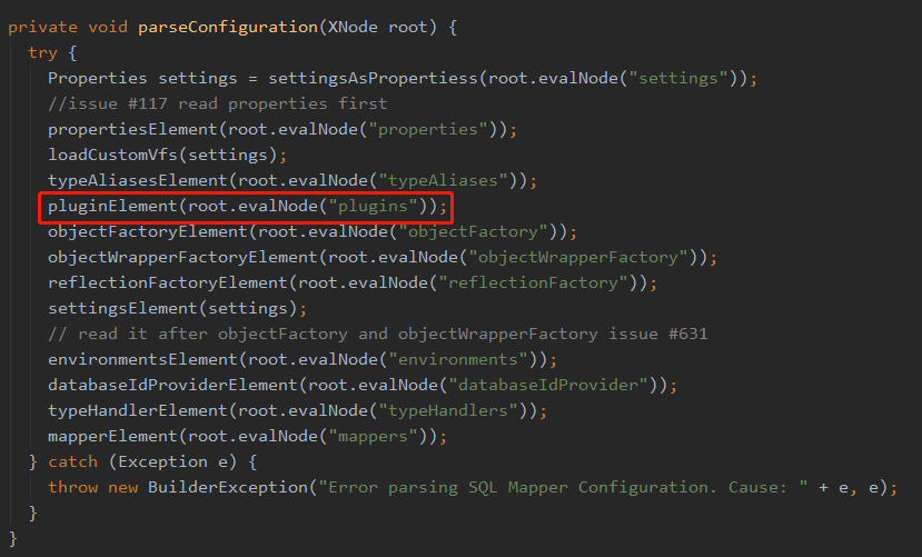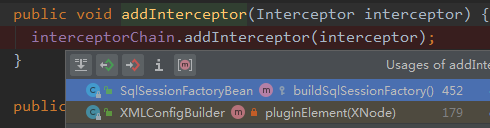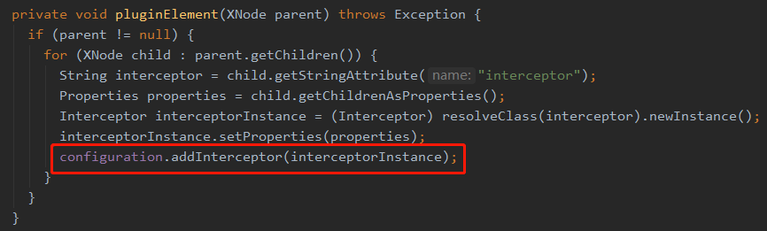 解析到 plugins 标签,则进入 pluginElement 方法中,在这个方法里面调用 addInterceptor: