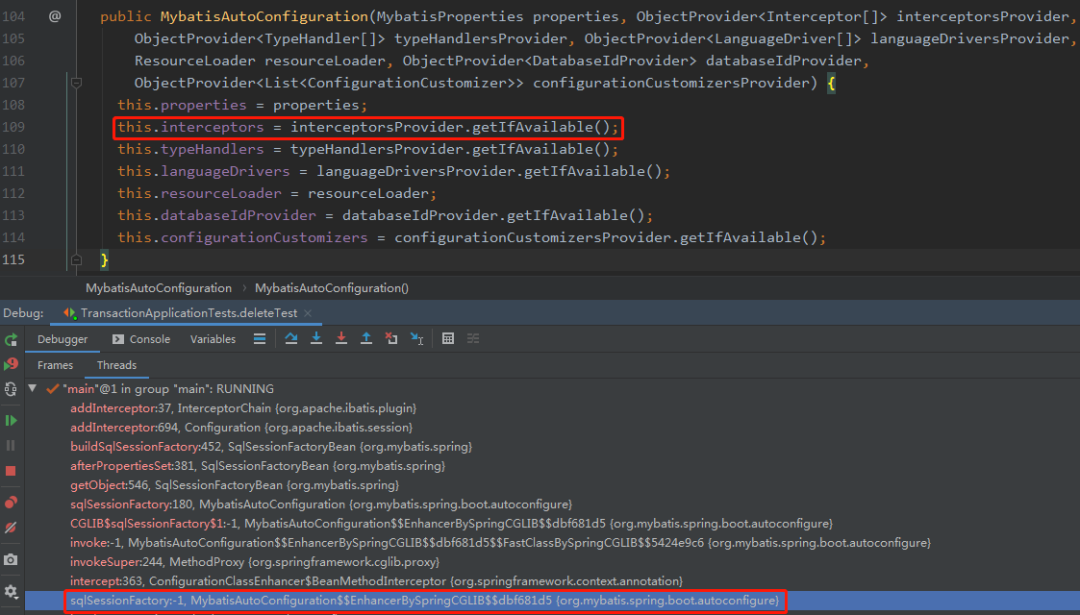 在 MybatisAutoConfiguration 的构造方法里面初始化了 interceptors。