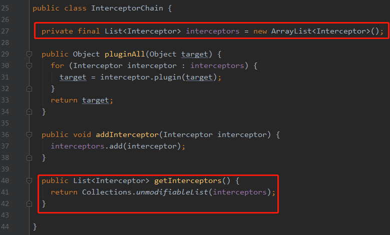 2. 第二就是 getInterceptors 返回的是一个不可修改的 List 。所以,要对集合 interceptors 进行修改,只能通过 addInterceptor 方法进行元素添加,保证了这个集合是可控的。