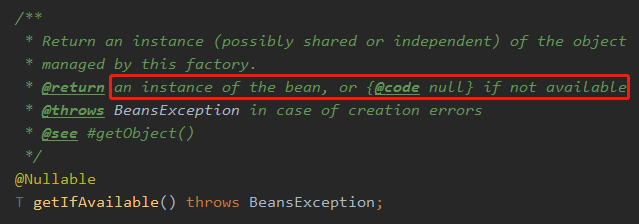 对 getIfAvailable 方法不熟悉的朋友可以去补一下这块的知识,我这里只是给大家看一下这个方法上的注释: