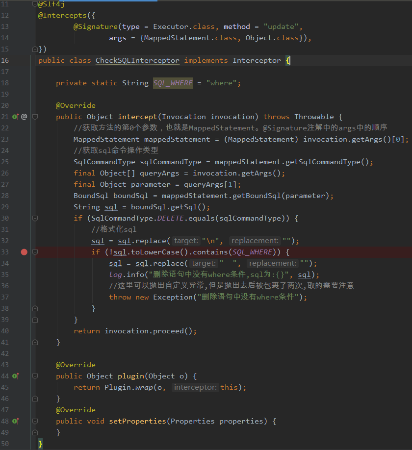 本文用拦截器的目的是判断 delete 语句中是否有 where 条件。所以,开发出来的插件长这样: