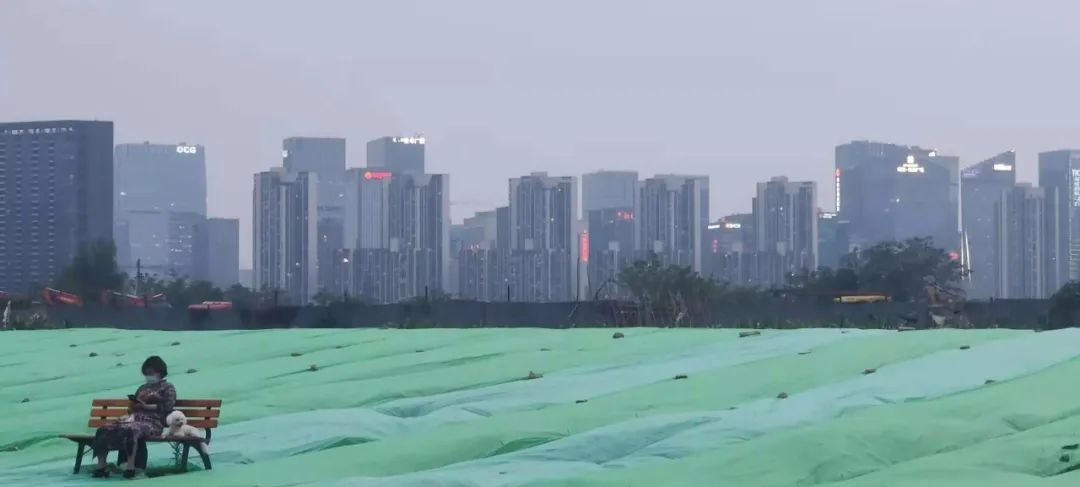 这是一个还没有开发完成的草坪。远处的高楼,就是成都的软件园区。软件园和草坪之间只有一条河间隔。河的对岸是工作,河的这边是生活。