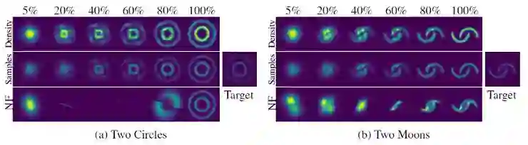 为了证明 CNF 的有效性,本文测试了概率密度从高斯分布到两个目标分布的转换,如下图所示。