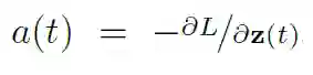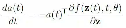 在第二步中,使用了 ODE 解的定义,在第三步中,将 ODESolve 作为求解 ODE 的操作符引入。正如我前面提到的,这个操作符依赖于初始状态 z(t0)、数 f、初始和结束时间 t0、t1 以及搜索的参数 θ。「伴随法」现在确定了损耗函数 w.r.t 的梯度,其隐藏状态为: