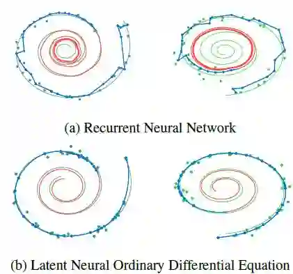 该体系结构在一个双向二维螺旋的合成数据集上进行了测试,该数据集在不规则的时间点采样,并且数据中有高斯噪声。下图定性地显示了 Latent Neural ODE 模型的优越建模性能: