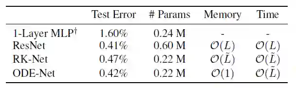 接下来是论文中最有趣的部分:相关的应用。作者在论文中提到的第一个应用是在监督学习领域,即 MNIST 书写数字分类。结果表明,该方法与参数较少的残差网络性能相当。本文中用于评估的网络对输入图像进行两次采样,然后应用于 6 个残差块。总之,网络包含大约 60 万个参数。ODESolve 网络使用单个 ODESolve 模块替换 6 层网络。此外,作者还对 RK 网络进行了测试,除了使用 Runge-Kutta 方法直接反向传播误差外,该网络与 RK 网络相似。如上所述,您可以将传统神经网络中的层数与 ODE 网络中的评估数联系起来。这两个网络的参数个数为 22 万个,重要的结果是,使用大约 1/3 的参数,RK 网络和 ODE 网络的性能与残差网络大致相同。此外,ODE 网络的内存复杂性是恒定的(见下图)。