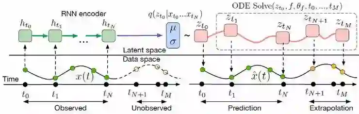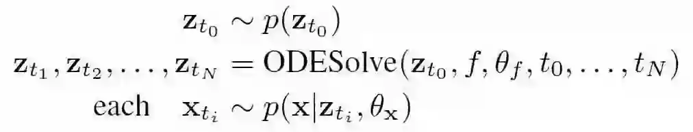 基于 ODE 模块的解决方案是一个连续时间生成模型,在给定初始状态 z0 和观测时间 t0…tN 的情况下,该模型计算潜在状态 z_t1…z_tN 和输出 x_t1…x_tN: